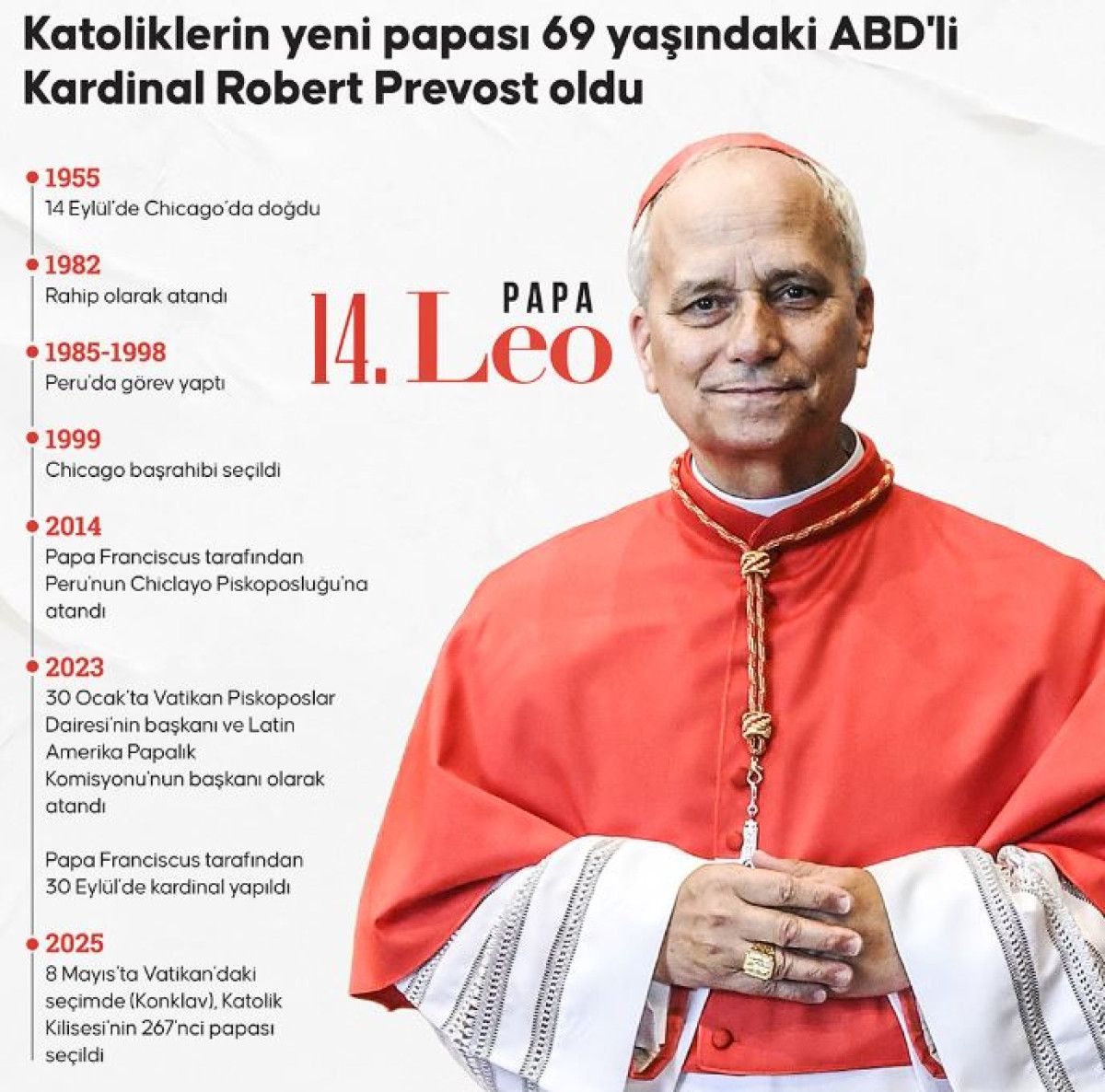 Peru’da uzun yıllar görev yapan ve Peru vatandaşlığı da bulunan Prevost, 1982’de rahip olarak atandı ve 30 Eylül 2023’te selefi Papa Franciscus tarafından Kardinal yapıldı.