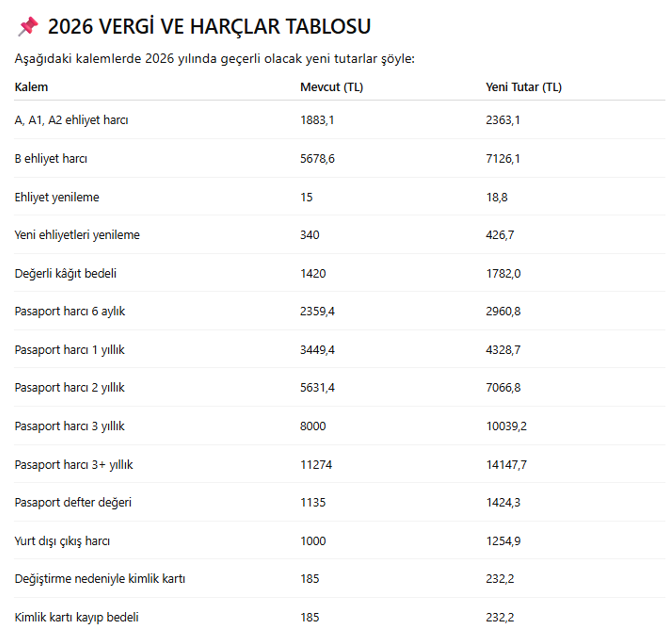 2026 VERGİ VE HARÇLAR TABLOSU