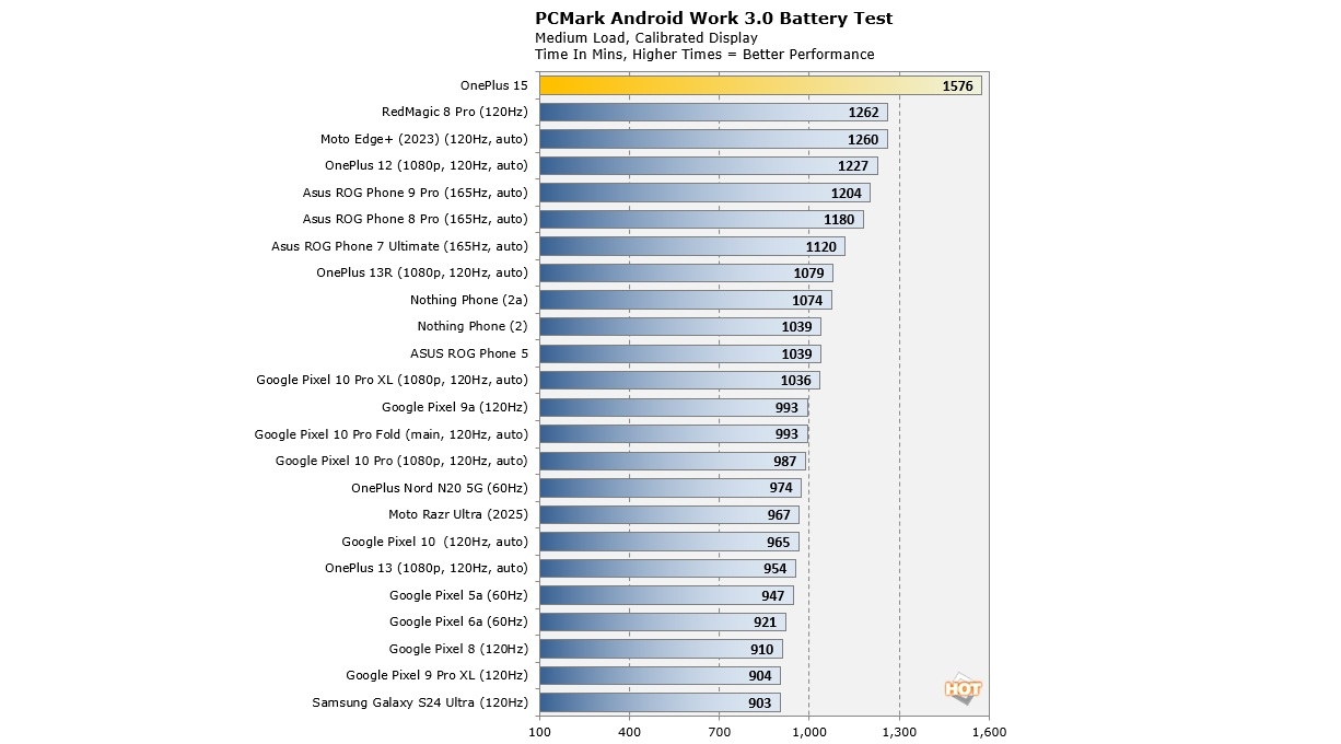 Kaçıranlar için OnePlus 15’in bataryası iki adet 3.650mAh silisyum-karbon hücreden oluşuyor. Performans tablosunun devamında ise, RedMagic 8 Pro (1.262 dakika), Moto Edge+ 2023 (1.260 dakika) ve OnePlus 12 (1.227 dakika) gibi modeller yer alıyor. Google Pixel 10 Pro Fold, Pixel 9a veya Samsung Galaxy S24 Ultra gibi modeller ise 900-1.000 dakika aralığında değerler elde etti.